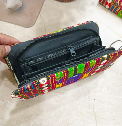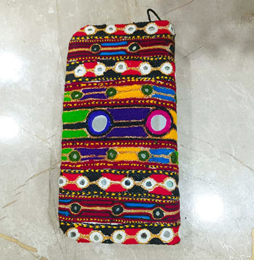 Carry your essentials in a piece of portable art with this stunning, functional hand purse. The exterior is a miniature masterpiece, featuring the intricate, colorful embroidery and sparkling Shisha mirror work found in the Sindhi and Balochi textile traditions.
